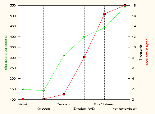 Since the extra delays come with each new packet, MNP protocol gets more and more effective as packet sizes increase and fewer packets are actually sent. Testing the full spectrum from Kermit to Zmodem, it showed that MNP protocol could provide high transfer rates for non-compressed data.