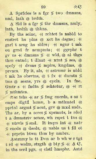 practically founded," then goes into this description. A (turn of the century word for surface) is a figure of two dimensions, namely length and breadth. A solid is a figure of three dimensions, namely length, breadth and thickness. By this science, the architect is enabled to construct his plans and exact his designs, the general to arrange his soldiers, the engineer to make out ground for encampments, the geographer to give us the dimensions of the world, and all things therein contained; to delineate the extent of seas, and specify the divisions of empires, kingdoms and provinces. By it, also, the astronomer is enabled to make his observations, and to fix the durations of times and seasons, years and cycles. In ---, Geometery is the foundation of architecture, and the root of mathematics. After that, you're on your own. Keep at it and eventually it makes sense. The antiquated word usage is generally the biggest obstacle. | ![]() |